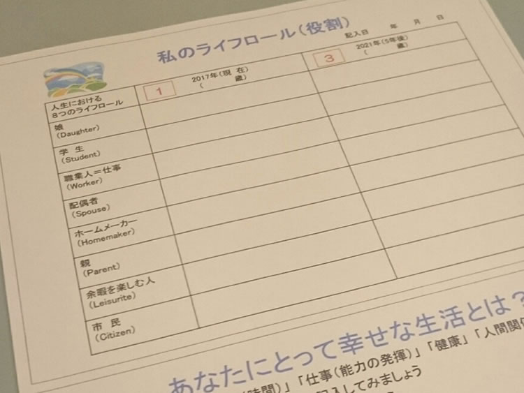| 内容 | ワークシートを中心に、自分自身を見つめ振り返りながら、それぞれにとっての未来の幸せな生き方を描き、5か年目標計画を作成します。 |